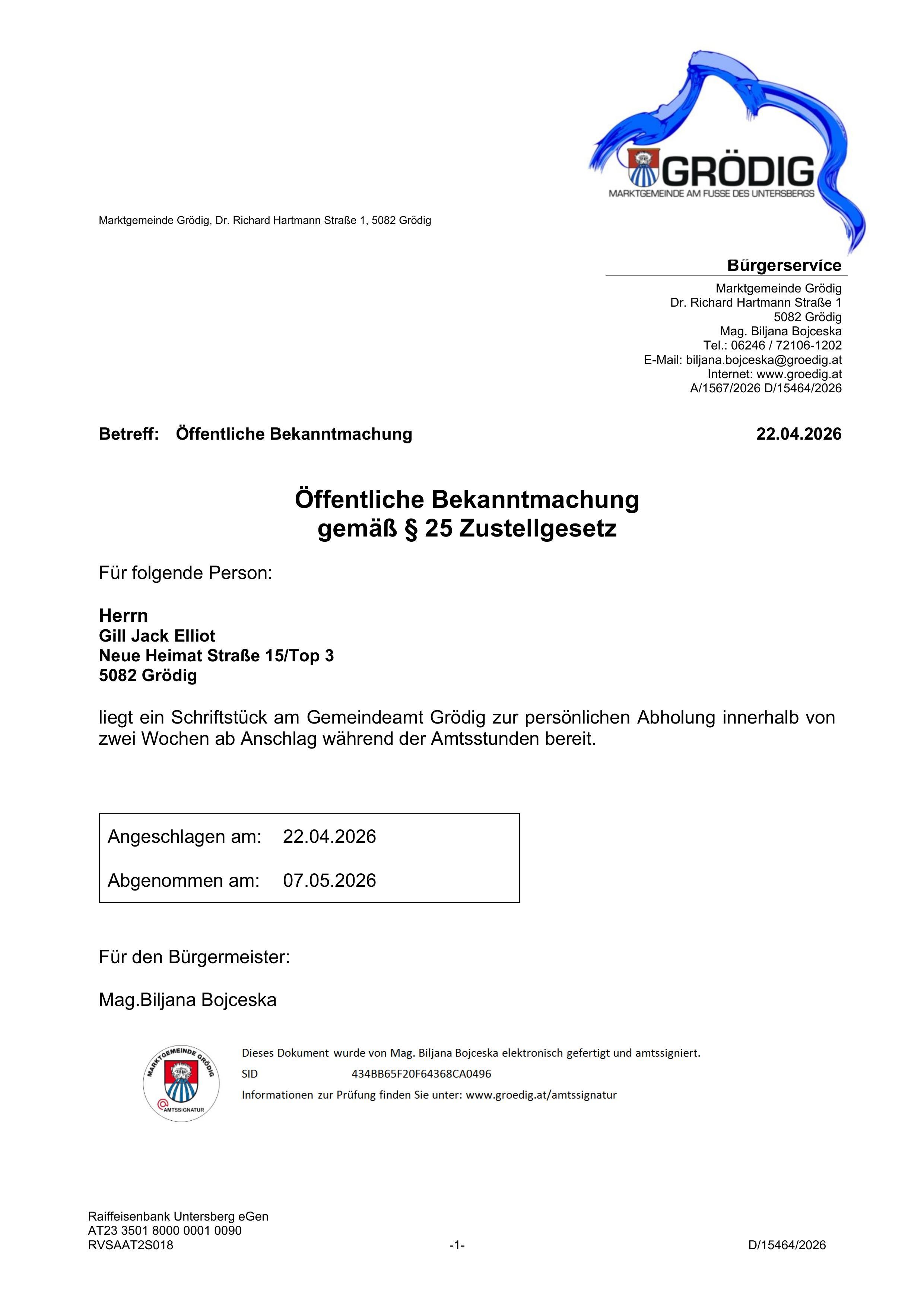 Öffentliche Bekanntmachung gem. § 25 Zustellgesetz